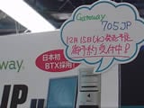 数日前は大きな柵だったけど、PCが見えにくいからか小さな柵に変更されていた。デモ機を置いている部分に人口芝も使われるなど、牛の柄や、牛POPを使ったGATEWAYらしい「カントリー」な感じ。ツクモには「ゲートウェイ日本上陸」のポスターがいろな場所にあったけど、多くが12月10日発売(予定)になっていて、「15日発売予定」になっていたPOPは少なかった印象。