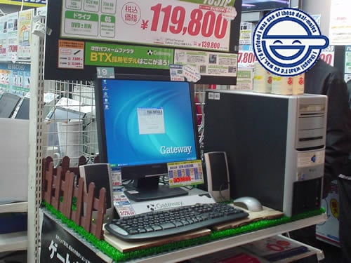 12月10日から販売が始まる予定だったGATEWAYのPCは、発売が15日に延期されていたが、GATEWAYの取り扱いをしているツクモではすでに展示機もでていて、ツクモeXではGATEWAYらしい展示がされていた。もしもツクモで同人ソフトの取り扱いをしていて、最近発売になったSky Lounge Gardenさんのmilk pot2がデモPCのそばに置かれていたりすると、面白そうなんだけど。