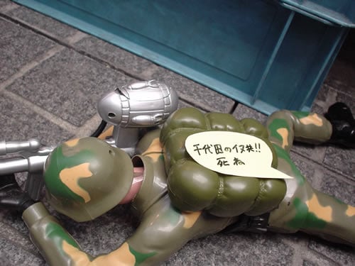 中央通り沿いにあるバラエティーショップ秋葉原MADではいろんな面白アイテムが販売されているが、「只今戦闘中 大人気ホフク前進突撃兵」の背中には「千代田のイヌ共!!」とも書かれていた。ホフク前進兵はかなり前から店頭デモされているもので、アキバでは当たり前の光景になっているような気もするけど、これまでお伝えしてなかったので