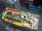 単三電池3本を入れて足に付いているスイッチを入れると"ウィーンウィーン”と言う 機械音と共にリアルなほふく前進を開始!そしてライフルのスコープを点灯させBB弾を 連射するとてもリアルギミックなおもちゃです。秋葉原MADにあった6mmBB弾を連続発射できるホフク前進突撃兵こと弾丸ソルジャーの背中には「千代田のイヌ共!!」や「サワランといてな ワシ忙しいねん」などと書かれたPOP?が取り付けられていて、秋葉原MAD店頭の歩道では、弾丸ソルジャーが活躍している様子を毎日みることができる。