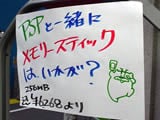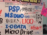 PSPではデータセーブや、映像転送用などの用途でメモリースティックDUOを使用するが、電遊市場ではバルクメモリースティックDUO16MBが1100円だったり、クレバリー1号店では「PSPと一緒にメモリースティックはいかが?」などが入り口に掲示されていて、PSP特需?の取り込みを図っていた感じ。その他、あきばお~3号店入り口には「運良くPSPを購入できた方へ」というようなメモリスティックDUOのPOPもあったような気がする。