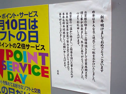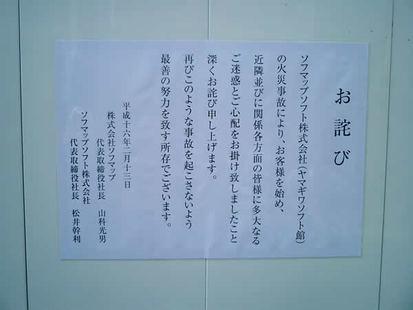 新年明けましておめでとうございます火災発生後のお詫び文はソフマップ社長とソフマップソフト社長の2人の名前だったけど、2005年の新年挨拶は「店長」となっていた。なおヤマギワソフト館通用口横の喫茶店はまだ火災から閉店したまま。