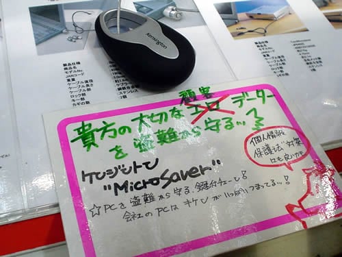 Wondercityにあったケンジントンのセキュリティー商品は、PC本体の盗難抑止用のアイテムがいくつか品揃えされていて、商品概要では「人の出入りの多いオフィスや会議室、出張先(ホテル、新幹線、飛行機)、学校などのパソコン教室などパソコンを使う場所でご利用いただけます。」となっているケンジントンのマイクロセーバーリトラクタブルロックのサンプルも出ていたが、売り場には「貴方の大切な