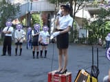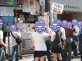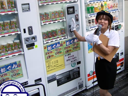 6月13日に2回目の「あきばバスなしツアー」が行われていて、バスガイドの格好?コスプレ?をしたまきのめぐみさんが、アキバの名所?迷所?を案内していた。上の画像は先日POPが新しくなり自動販売機がきれいになったおでん缶の案内の様子。