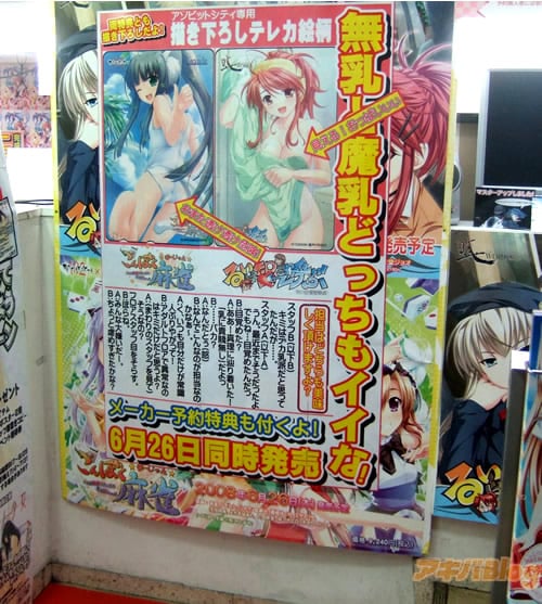 アソビットゲームシティで、6月26日発売の美少女ゲームこんぼく麻雀【AA】とるいは智を呼ぶ【AA】の描き下ろし特典テレカの告知が2枚一緒になって出ている。アソビット特典テレカは「こんぼく麻雀」がアユムの白スク水(バストない)で、「るいは智を呼ぶ」は皆元るい(85Dサイズ)。テレカ絵告知では『乳に貴賤無し!』などを謳っていた。
