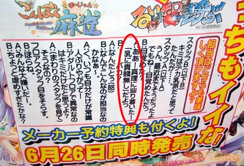 アソビットゲームシティでは、先日の乳の日(ちちのひ)セールで「貧乳も巨乳も微乳も ぜーんぶ10%引き」をやっていて、この「こんぼく麻雀」・「るいは智を呼ぶ」の描き下ろしテレカ絵告知では、これまでデカ乳派だった担当氏が最近目覚めたみたいで、『無乳と魔乳 どっちもイイな!』とか『乳に貴賤無し!』を謳っていた。