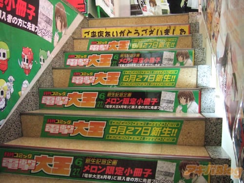 メロンブックスへ行ったら、入口階段のところが大王のPOPだらけになってましたよ~。行ったことがある方ならわかると思いますが、見事に大王のPOPだらけになってました。横の壁だけでなく、階段そのものにもPOPが貼られてましたw(店から出るときに判りますw) あきばらいふさん "新生"電撃大王がメロンブックスをジャック?!