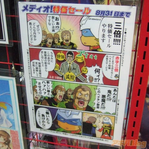 メディオ!秋葉原店で、8月31日まで三倍特価セールをやっていて、ガンダムさんみたいなシャアとかランバ・ラル隊が登場する三倍特価セールPOPが出ている。