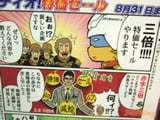 三倍特価セールは告知によると『赤字三倍 どこまでも売り尽くし ハラキリ特価 出血大サービス』だそうで、シャアに扮した?メディオのエライ人いわく「赤字は貴様達の給金から差し引いた上、無能な貴様はさらに減棒して対処します」。ランバ・ラル隊みたいなメディオスタッフは、涙を流しながら『あんたは鬼だ!悪魔だ!このヘナチン野郎!』・『新しい嫁とハァハァさせろ!』とか。