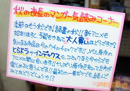 ゲーマーズ本店1Fで、10月からアニメ放送が始まる(始まった)コミックスをまとめた『秋の夜長のマンガ一気読みコーナー』ができている。並んでいたのは、「ケメコデラックス!」・「かんなぎ」・「とある魔術の禁書目録」・「とらドラ」・「ヒャッコ」などで10作品で、『読書の秋!新アニメも始まりますし、予習もかねて大人買いはどうですか?』などとしていた。