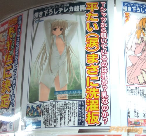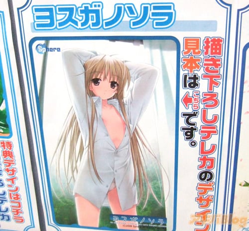 アソビットシティの「ヨスガノソラ」特典テレカは穹の貧乳裸Yシャツイラストで、告知では『Yシャツから覗いているのは乳か?乳なのか?平たい(涙)まさに洗濯板』を謳っていた。