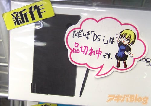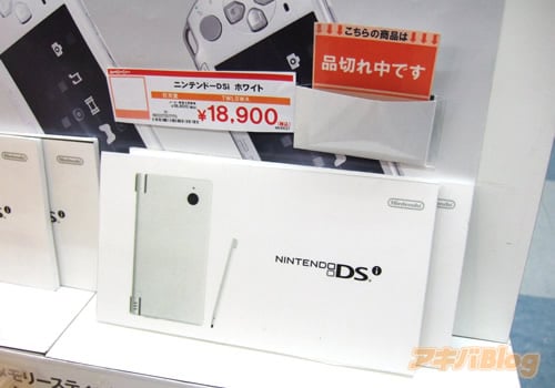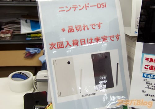 ニンテンドーDSi【AA】が11月1日に発売になった。秋葉原では店頭販売分をやったお店もあったみたいだけど、ソフマップAM館でのDis予約もすぐに終わったくらいだったからか、徹夜組を含めて開店と同時に瞬殺だった様子。夕方すぎには、DSiの在庫を見かけるわけもなく、各店にニンテンドーDSiの『完売・品切れPOP』が出ていた。