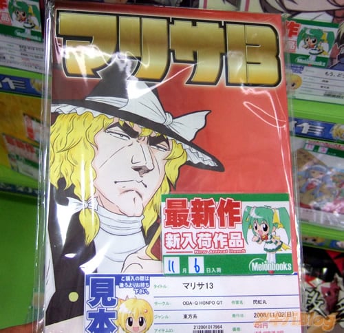 11月3日東方紅楼夢&11月4日ゴルゴ13中心イベントでの、サークルOBA-Q HONPO QTの新刊同人誌『マリサ13』が、メロン秋葉原店に6日に入荷していた。ゴルゴ13+東方のほか、はだしのゲン+東方、銀魂+東方、キン肉マン+東方、ソードマスターヤマト+東方の計5編(各2~3P)を収録し、表紙がデューク東郷な魔理沙な東方MADパロ。