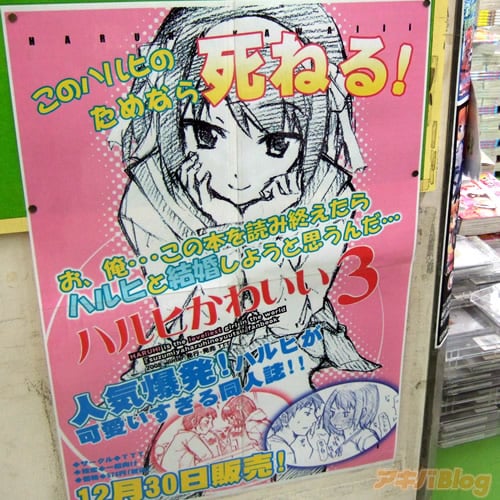 メロン秋葉原店に、サークルTTTの冬コミ新刊の涼宮ハルヒ同人誌『ハルヒかわいい3』告知ポスターが出ていた。「ハルヒかわいい」は、いちゃいちゃツンツンデレデレハルヒを描いたもので、前作「ハルヒかわいい2」がブレイク?したもの。新刊告知ポスターでは『ハルヒが可愛いすぎる同人誌!』・『このハルヒのためなら死ねる!』などとなっていた。
