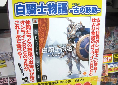 レベルファイブ制作のPS3用RPG白騎士物語-古の鼓動-が25日に発売になった。パッケージ裏面の謳い文句は『終わらせたくない感動と、終わることのない冒険のRPG』。アソビットゲームシティが店頭デモをやっていて、POPは『壮大な物語のオフラインRPGと、仲間たちとの無限の出会いが待つオンラインPRGの2作がこれ1本で遊べる!』だった。