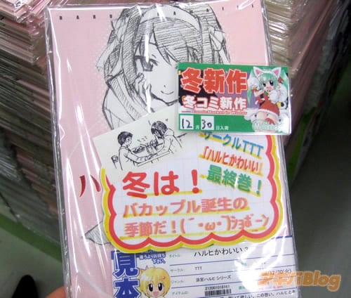 サークルTTTの冬コミ新刊ハルヒ同人誌『ハルヒかわいい3』が、30日に同人ショップでも販売が始まった。メロン通販では『こちらも赤面せずにはいられない、ピュアなハルヒの超ツンデレラブコメ』などと紹介していたハルヒとキョンのいちゃいちゃ同人誌。メロン秋葉原店には1000冊くらい積んであり、POPは『冬は!バカップル誕生の季節だ!』。