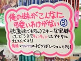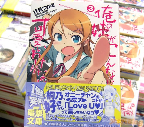 『俺の妹』は1巻が発売→完売→再入荷→完売といった売れ行きで、インタビューによると2巻も『担当編集:めちゃくちゃ売れました(笑)』だった様子。とら1号店・ゲーマーズ本店・K-Booksでは、今回の俺の妹3巻【AA】が今月の電撃文庫新刊14点の中で一番広く取ってあり、とら1号店1Fは12面陳、ゲマ本店5Fは15面陳で、K-Books秋葉原新館は既刊と合わせて12面陳してた。