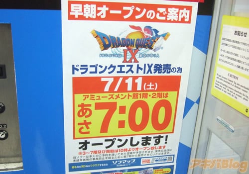 アソビットゲームシティでは以前から店頭に告知が出ていて、7日にはソフマップAM館・本館に、ドラクエ9早朝販売の告知が出ていた。ソフマップAM館では、入り口横に『早朝7時オープンします』とか『ソフマップアミューズメント館1階・2階はあさ7:00オープンします!当ソフトは多くのご予約を頂いており、混乱が予想されます。発売日当日は未成年等の事故防止を図るため、朝7時から販売させていただきます』とのこと。ソフマップは秋葉原以外でも早朝販売をする様子