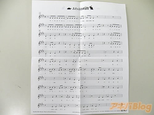まずはCD「放課後ティータイム」を開けてみた。CDはStudioMixとLiveMixの2枚組。さらにはCD「ふわふわ時間」のジャケットイラスト使用の写真風カードも入ってる。メロ譜(ワンコーラス)が封入されている。なんだか気分は、ハートDO-KI☆DO-KI!