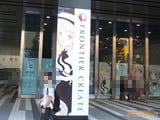 入口でイベントのパネルを持った東方コスプレの男性 東方ゲーム大会のスタッフも東方コスプレ |
