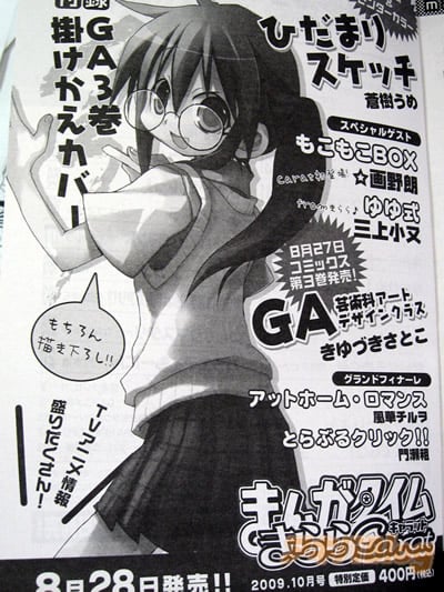 さて。お話は変わりますが、まんがタイムきららCarat10月号、こちらに特別付録がつくというウワサを耳にされた方はいらっしゃいますでしょうか。先月号のキャラット次号予告によると、8月27日の「GA芸術科アートデザインクラス」3巻の発売に合わせて、かけかえカバーがつくらしい…。
