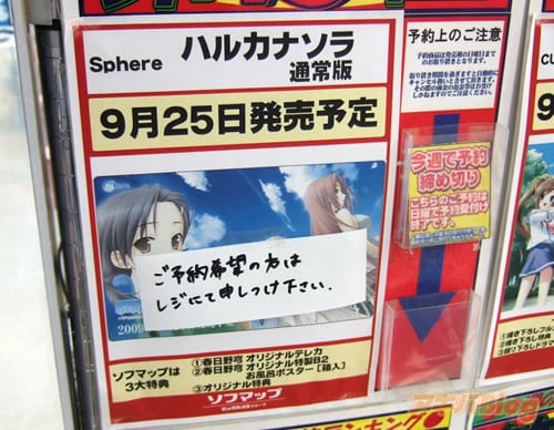 9月25日発売予定の、美少女ゲーム「ハルカナソラ」【AA】は、すでにアキバのお店では限定版は予約終了してたけど、発売日を前倒しした通常版もそろそろ予約受付が終わりそうっぽい。アソビットGは通常版の予約はすでに終了し、ソフマップAM館では「予約はレジに申しつけください」で、『(予約終了の)リーチ状態です』とのこと。