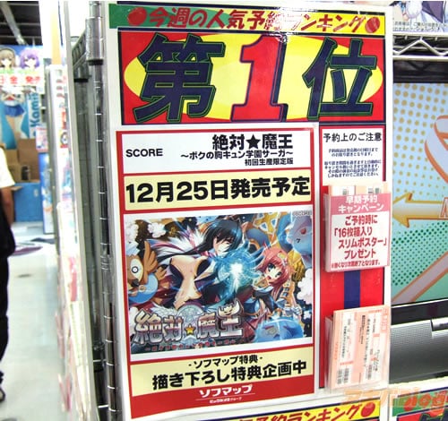 今週のソフマップAM館&ソフマップPCゲームアニメ館の美少女ゲーム予約ランキングは、18日から予約が始まったSCOREの「絶対★魔王~ボクの胸キュン学園サーガ~」が1位だった。原画:片桐雛太氏、八葉香南氏、七統十爾氏、桃井涼太氏による、異世界で魔王子候補生になった主人公の『絶対☆ドキドキ魔界学園AVG』みたい。