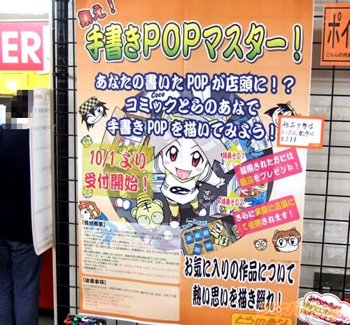 とらのあなの手書きPOP募集ポスターは、売り場に付けるPOPを実際にお客さんから募集しているもので、、『集え!手書きPOPマスター!あなたの書いたPOPが店頭に!?コミックとらのあなで、手書きPOPを描いてみよう!』、『みなさまの秘めているパッションをPOPにしてみませんか』、『お気に入りの作品について熱い思いを書き綴れ!』などなど。