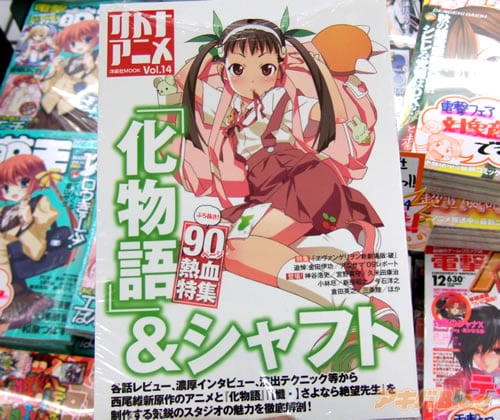 オトナアニメVol.14【AA】は化物語&シャフト特集を約90ページ収録し、書籍情報では『「化物語」&シャフトぶちぬき90ページ熱血特集!』・『表紙&特集【化物語】TV放映全12話を名ゼリフとともに濃厚レビュー!尾石達也シリーズディレクターが制作秘話を激白!』、『【特集】さよなら絶望先生。原作者・久米田康治にロングインタビューを実施!!糸色望役の神谷浩史がシャフト作品を語る!3期の全話レビューを最速掲載します!!』、『【特集】シャフト これは貴重! 新房昭之(監督)がシャフトをマジメに語ります!』などを謳い、表紙は八九寺真宵。