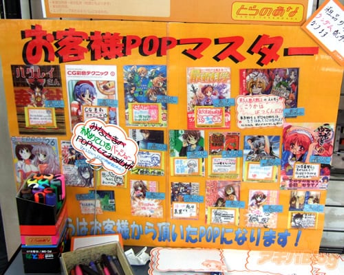 とらのあな秋葉原A店で、告知ポスターなどによると『あなたの書いたPOPが店頭に!?コミックとらのあなで、手書きPOPを描いてみよう!』、『みなさまの秘めているパッションをPOPにしてみませんか』、『お気に入りの作品について熱い思いを書き綴れ!』という「集え!手書きPOPマスター!熱き思いを書き綴れ!」を10月からやっていて、お客さんから手書きPOP募集している。