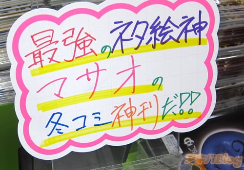 メロン秋葉原店のPOPでは「最強のネタ絵神 マサオの冬コミ神刊だ!」「吹いたら負けです。新年、初笑いはこの本で!」などとしていた。