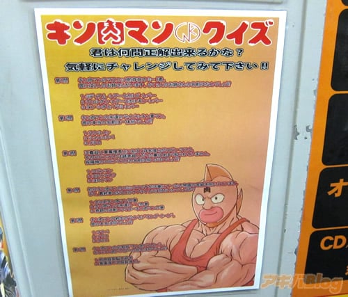 キン肉マン37巻の再入荷POPが「ゲェーッ!ソッコー重版された!?」だったとらのあな秋葉原店Aで、エレベーターの中に『君は何問正解出来るかな?気軽にチャレンジしてみて下さい!』というキン肉マンクイズが貼ってあった(いつから?)。「ミート君のお姉さんの名前は?」「キン骨マンの本名は?」など、三択問題が6問。