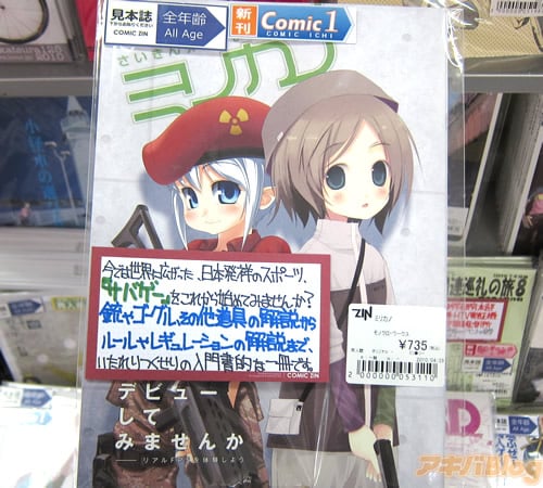 サークルモノクロ・ワークスのサバイバルゲーム入門同人誌『ミリカノ』に、コミックZIN秋葉原店でPOPが付いていた。表紙には『サバゲーデビューしてみませんか。リアルFPSを体験しよう』・『さいきん弾(タマ)ってませんか?』とかが書いてあり、ZINのPOPによると『サバゲー、初めてみませんか?いたれりつくせりの入門書的な一冊』とのこと。