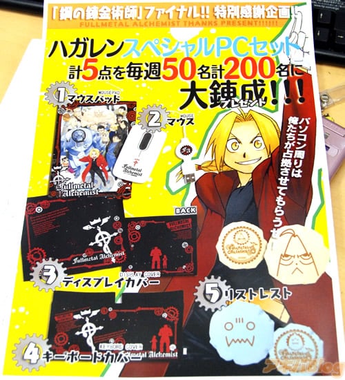 「鋼の錬金術師」PCグッズ5点セットを、抽選200名様にプレゼントです。ディスプレイカバー、キーボードカバー、マウス、マウスパッド、リストレスト…と、まさしく完全包囲!! アキバBlogをお読みの筋金入りの「ぱそっこ」にも、自信をもってお勧めできます!!! そんなプレゼント企画を担当しているガンガンONLINE編集部のShow-G氏・ナッツミー氏に、PRコメントをいただきました。