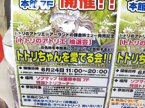 なお、ソフマップ本館ではトトリのアトリエ発売日(6/24)に、ソフマップで購入した人を対象に、非売品の特大タペストリー(これ?)などが当たる『トトリのアトリエ発売記念抽選会』を行う予定で、抽選会告知には『トトリのアトリエを買って、抽選で景品をゲットし、トトリちゃんずを愛でよう』などとしていた。