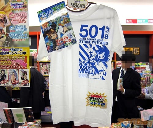 「コンプエース」10月号付録のストパンTシャツは、白地に芳佳がプリントされたもので、タグにも第501統合戦闘航空団のロゴ入り。とら秋葉原店AでストパンTシャツの見本を出していて、『今月の付録はストパンならぬ、ストT!』POPが付いていた。