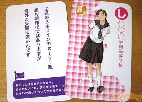 制服の特徴とヒントを書いた「読み札」と 女子高制服イラストと場所・設立年・URLなどを書いた「絵札」 |