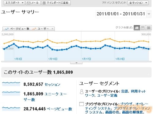 2011年1月の月間アクセス 2871万4445PV ユニークユーザー 186万5809人 |