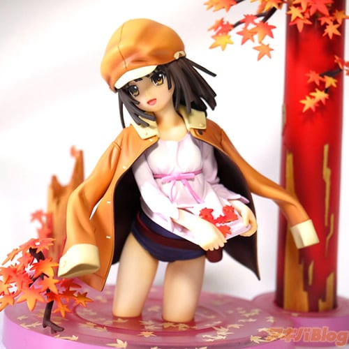 また、常時リソース不足さんのレビュー『撫子の大型立体化一段はヴィネット風。撫子をBD/DVDジャケ絵に忠実な、下にスク水を着込んだギリギリな姿で立体化するのみならず。背景である崩れた鳥居、重なり合う紅葉、刺さっている彫刻刀とお札まで再現し、一つのベースに収めているという空間構成の見事さも一役買ってます』、『直立用の交換用両脚も付属で、スク水の下半身を存分に拝む事が出来ます。内股でX脚気味の中学生と言う年齢相当な造型がまた堪らんやね』、『パーカーが外れた状態で脚パーツの交換も出来、小さめスラリとしたお尻もきっちり拝めます。』などもある。