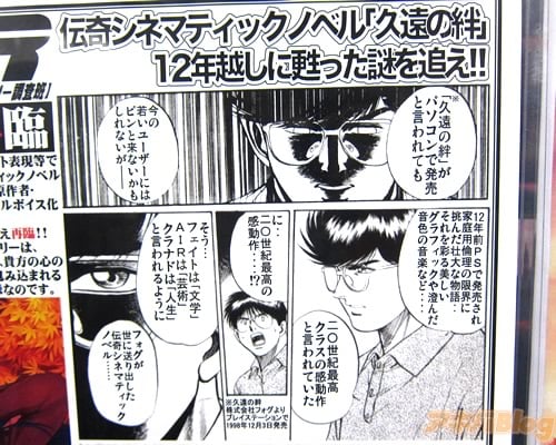 PC向け美少女ゲーム「久遠の絆 THE ORIGIN」【AA】が1日に発売になった。『久遠の絆』は1998年にPS版、2000年にDC版、移植PC版はHシーンやフルボイス化、シナリオの追加変更などがあるみたい。メディオ!秋葉原にはDC版発売当時の11年前の手書きPOPや、メディオ!ミステリー調査班の『久遠の絆は神話なんだよ!』があった。