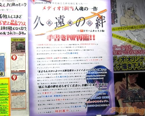なお、メディオ!秋葉原の担当氏は1998年の『久遠の絆』PS版をプレイされた際に『この「久遠の絆」という神話にあまりにも感動がマッハで「久遠の絆」の世界に精神を持っていかれまして』で、当時働かれていたお店で手書きPOPを作成されたみたい。その後のDC(