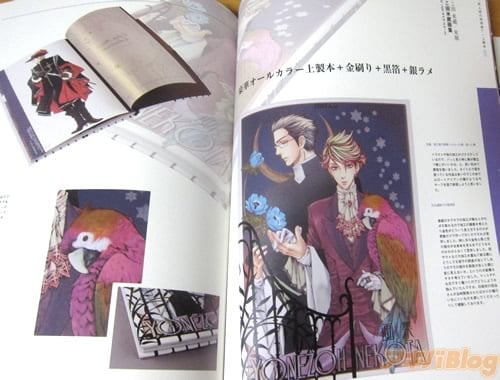 本体冊子には「村田蓮爾氏×星野リリィ氏の対談」「両氏の本の特殊装丁の解説」、過去20年以上にわたるいろんなサークルさんの特殊装丁の同人誌紹介を主に掲載し、分冊の「特殊加工イラスト集」は作家さんのイラストを特殊加工した「フィルムカラー×トランスタバック CHOCO氏」 「ドットプリント 城爪草氏」 「スペシャリティーズ 高河ゆん氏」 「フロッキー加工 藤枝雅氏」 「全面金箔氏 蔵王大志氏、影木栄貴氏」 「銀ラメ加工 西又葵氏」になってる(本フェチ)。