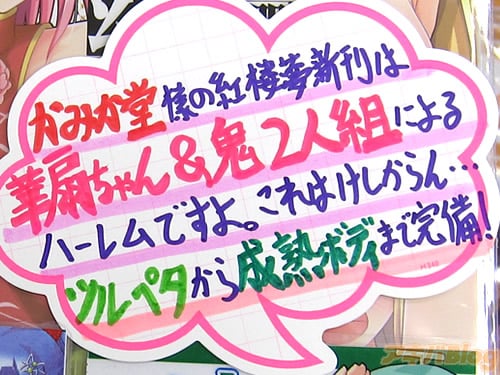 メロンブックス秋葉原店POP「華扇&鬼2人組みによるハーレムですよ。これはけしからん…」 「ツルペタから成熟ボディまで完備!」 |