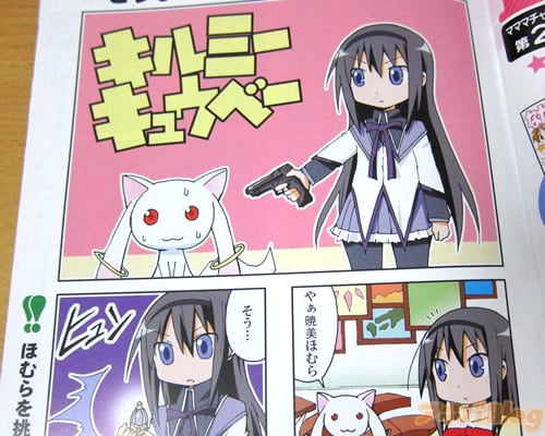 4コママンガ誌「まんがタイムきらら」・「まんがタイムきららキャラット」などの掲載のマンガを、まどか☆マギカでパロディーした同人誌で、表紙ロゴも「まんがタイムきらら」にそっくりで、TVアニメ「キルミーキュウベー」の広告や「マママチャンネルBD&DVD2巻」(Aチャンネル?)広告、裏表紙には玩具広告「DXきゅぅベェバスター」や、バーコードや特別定価とかも。