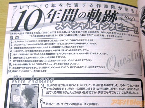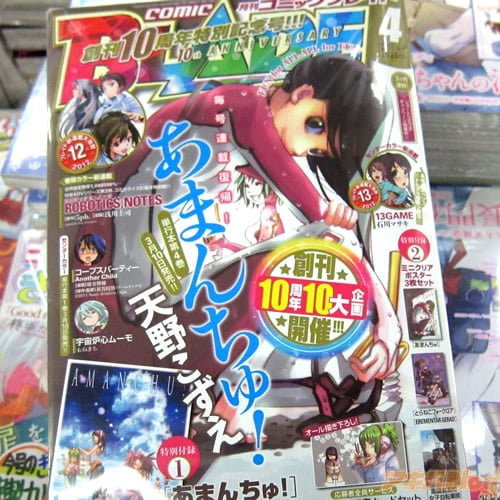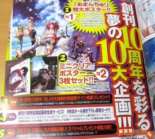 また、『月刊コミックブレイド4月号』は、コミックナタリーによると『記念号となる今号では、10の企画が実施されている』みたいで、10周年10大企画として『描き下ろし”あまんちゅ!”特大ポスター』『ミニクリアポスター3枚セット』『応募者全員サービス 6作品オール描き下ろし図書カード』『BLADE連載作家直筆サイン色紙プレゼント』『スペシャルプレゼント超拡大版』『10年間の軌跡スペシャルインタビュー』『描き手クイズ付きイラストギャラリー』『注目作家の仕事場大公開』『全誌面シークレットキャラクタークイズ』『小箱とたん&KAKERUが贈るダブル読み切り』などの付録収録・キャンペーンがあり、創刊10周年特別号には35作品を掲載(もくじ)してる。