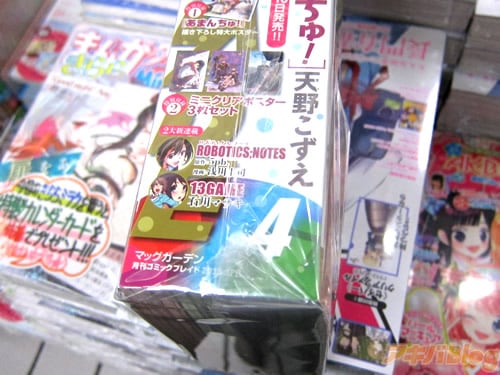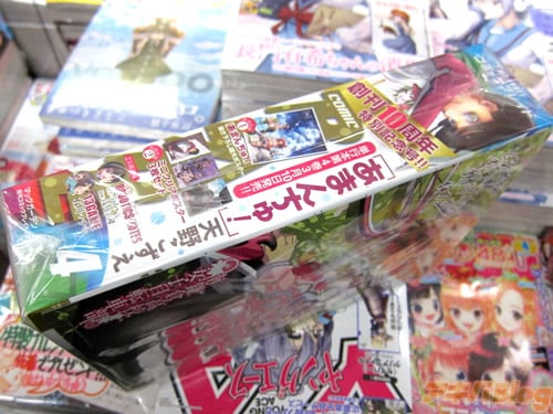 とら秋葉原店Aには、店舗特典のイラストシートと一緒に『月刊コミックブレイド10周年!!月刊少年ガンガンを抜く厚さにまで成長しました!!!』『単に厚いだけじゃない!!!これでもかという程の強力タイトルが満タン!!!』POPが付いてて、隣にあった『まんがタイムきららキャラット』と比較するとほぼ4冊分くらいの厚み、一般的なコミック(バクマン17巻)との比較はこんな感じ。