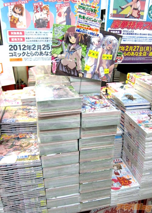 とら秋葉原店Aの月刊コミックブレイド4月号 となりの「まんがタイムきららキャラット」との比較はこんな感じ |
