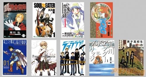 各タイトル1〜5巻(「デュラララ!!」「男子高校生の日常」は4巻まで)をラインナップ! 上段左より「鋼の錬金術師」(著者:荒川弘)、「ソウルイーター」(著者:大久保 篤)、「とある魔術の禁書目録」(原作:鎌池和馬 作画:近木野中哉 キャラクター原案:はいむらきよたか)、「魔法陣グルグル」(著者:衛藤ヒロユキ)。下段左より「ドラゴンクエスト列伝 ロトの紋章 完全版」(作画:藤原カムイ、脚本:小柳順治、設定:川又千秋)、「PandoraHearts」(著者:望月 淳)、「デュラララ!!」(原作:成田良悟 キャラクターデザイン:ヤスダスズヒト 作画:茶鳥木明代)、「荒川アンダーザ ブリッジ」(著者:中村 光)、「男子高校生の日常」(著者:山内泰延) |