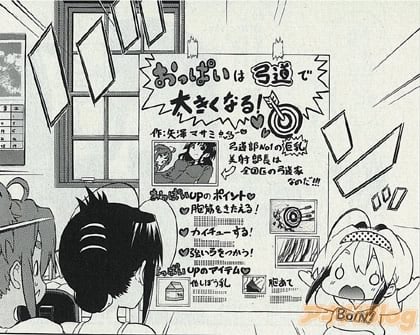 主人公の正弓は自分の小さい胸にコンプレックスを持ってます…。そこで、バストアップのために弓道を始めます。「あれ?矛盾してない?」と思いますよね?実は「弓を引くことによって胸筋が鍛えられ、胸が大きくなる!」と騙されてるんです(笑)。 その他にも"おっぱい"にまつわるエピソードが盛りだくさん