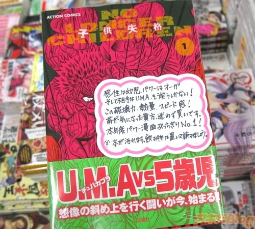 友利卓司氏のコミックス「NO LONGER CHILDREN 子供失格」1巻【AA】にK-BOOKS秋葉原新館でPOPが付いてた。なめくじ長屋奇考録さんによると『筋肉が異常発達した5歳児がチュパカブラをはじめとするUMAをボコボコにする漫画』で、K-BOOKSのPOPは『本年度パワー漫画ぶっちぎりNo1!飲み物は置いて読みましょう』とかになってた。